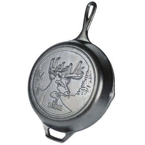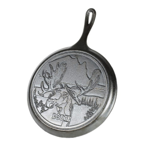 北アメリカ北部に広がる湖水地、ノースウッズに佇む雄のムースの刻印のあるロジック ラウンドグリドル 10 1/2インチ
