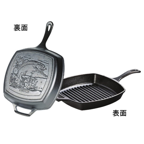 ジャンプするニジマスの刻印のある角型のグリルパン10 1/2インチ