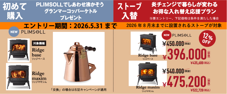 新規取付の方はグランマーコッパーケトル(小)をプレゼント、ストーブ交換の方はエントリーの上(当店にて手配いたします)でメーカー値引あり(2026.5.31までのお申し込みが必要)